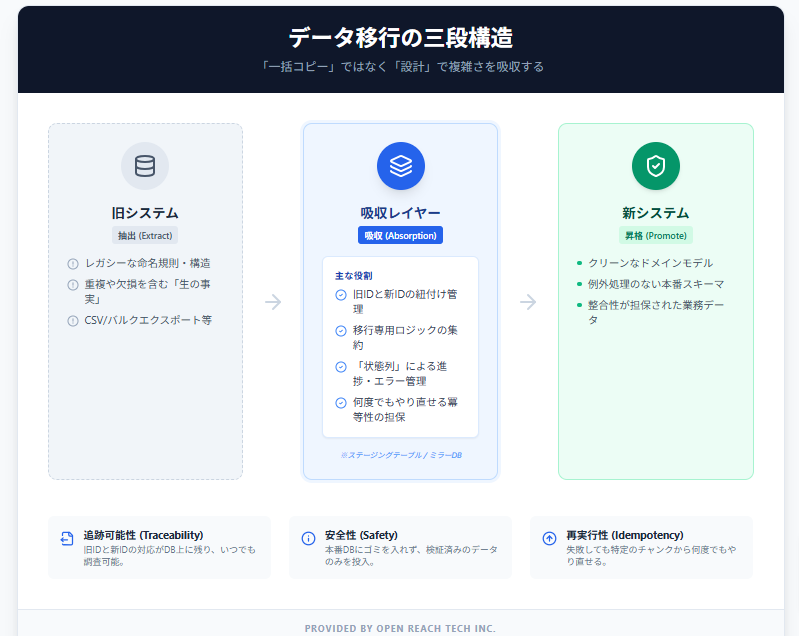 これを無理やり本番アプリのスキーマに流し込もうとするとどうなるでしょうか。新しいシステムのあちこちに旧データ用の例外処理や複雑な分岐が染み出してしまいます。結果として、移行に失敗して再実行したり、一部のデータだけを取り直したりするたびに、保守コストが跳ね上がってしまうのです。
