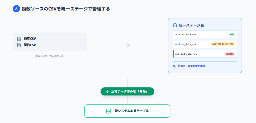 パターンA:複数ソースのCSVを統一形式のステージへ載せ、段階的に本番へ昇格する