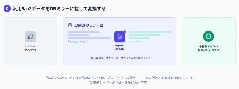 パターンB:汎用SaaSのエクスポートをDBミラーに載せ、本番の業務データへ写す