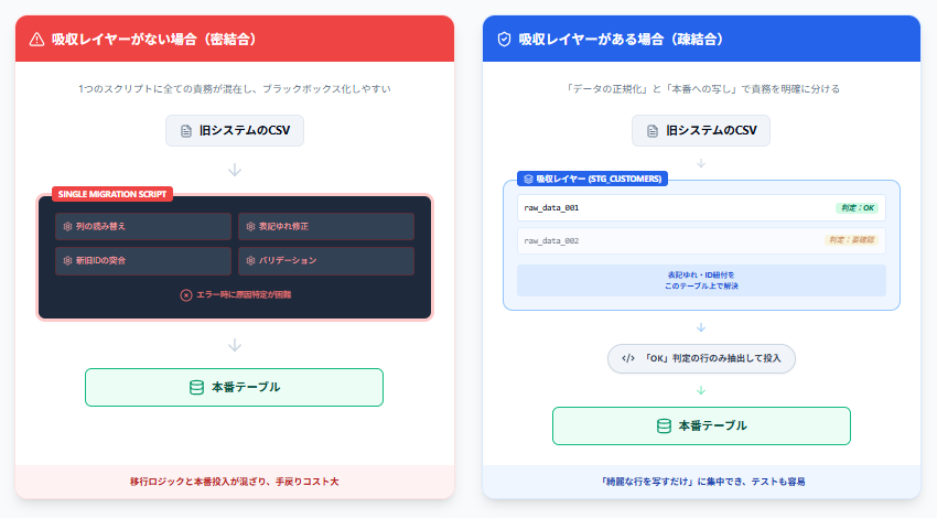 吸収レイヤーがある場合 — いったん stg_customers のような中間表へ、旧システムの出力どおりに載せます。別の処理で正規化、ID紐づけ、可否判定だけを更新し、本番へ回す処理は stg_customers のうち取り込み可と印を付けた行だけを customers に写すことにほぼ限定できます。旧データのクセをさばくコードと、もう整った行を本番形式で書くコードがファイルやジョブの単位でも分かれるので、移行が終わったあとに残すものも見通しよく残せます。